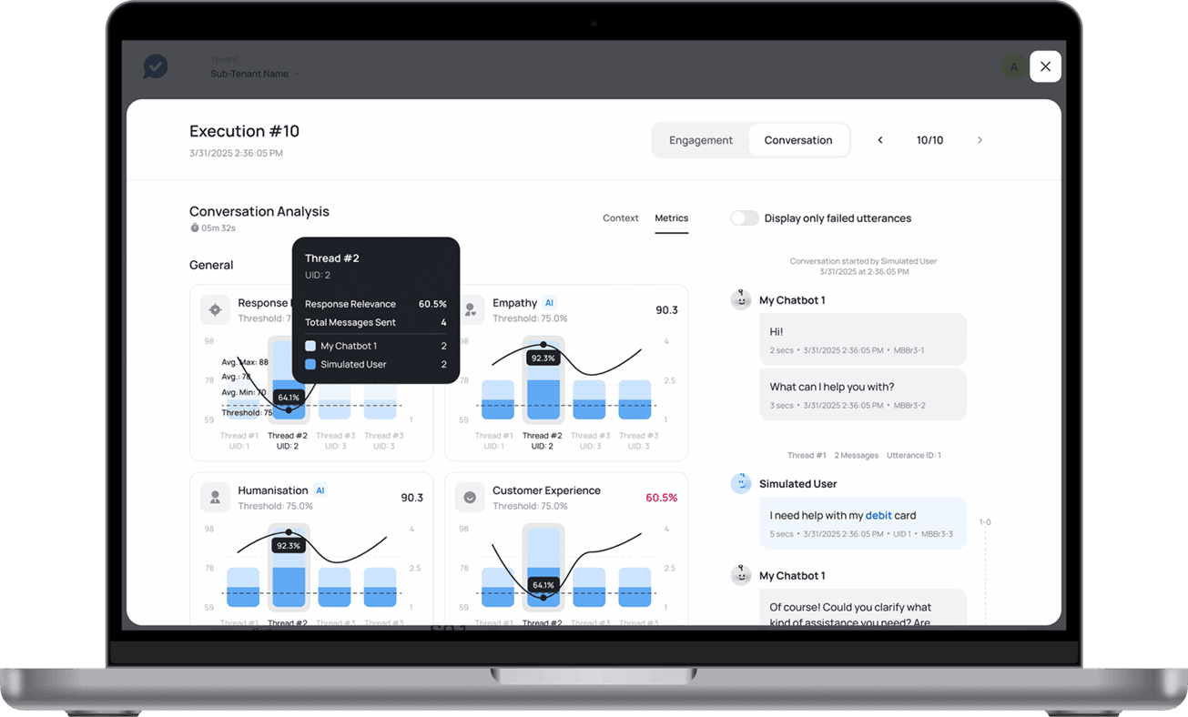We’re AI-native. Describe a journey in plain language and our GenAI agents create, execute, and analyse tests in minutes—no scripts, ports, or hardware to configure. Cloud-scalable runners let you run hundreds of voice and chat sessions in parallel, so a full regression that once took days finishes before lunch.